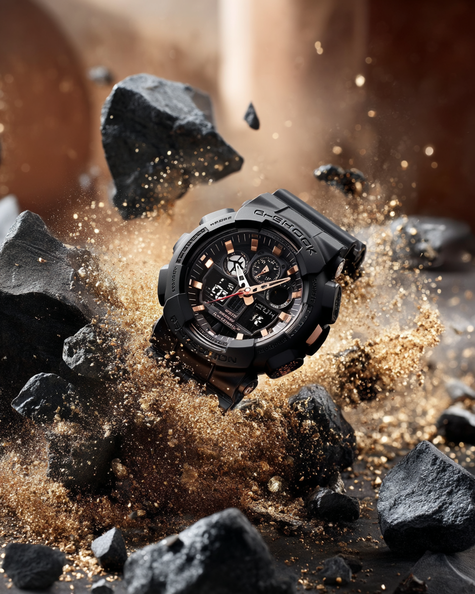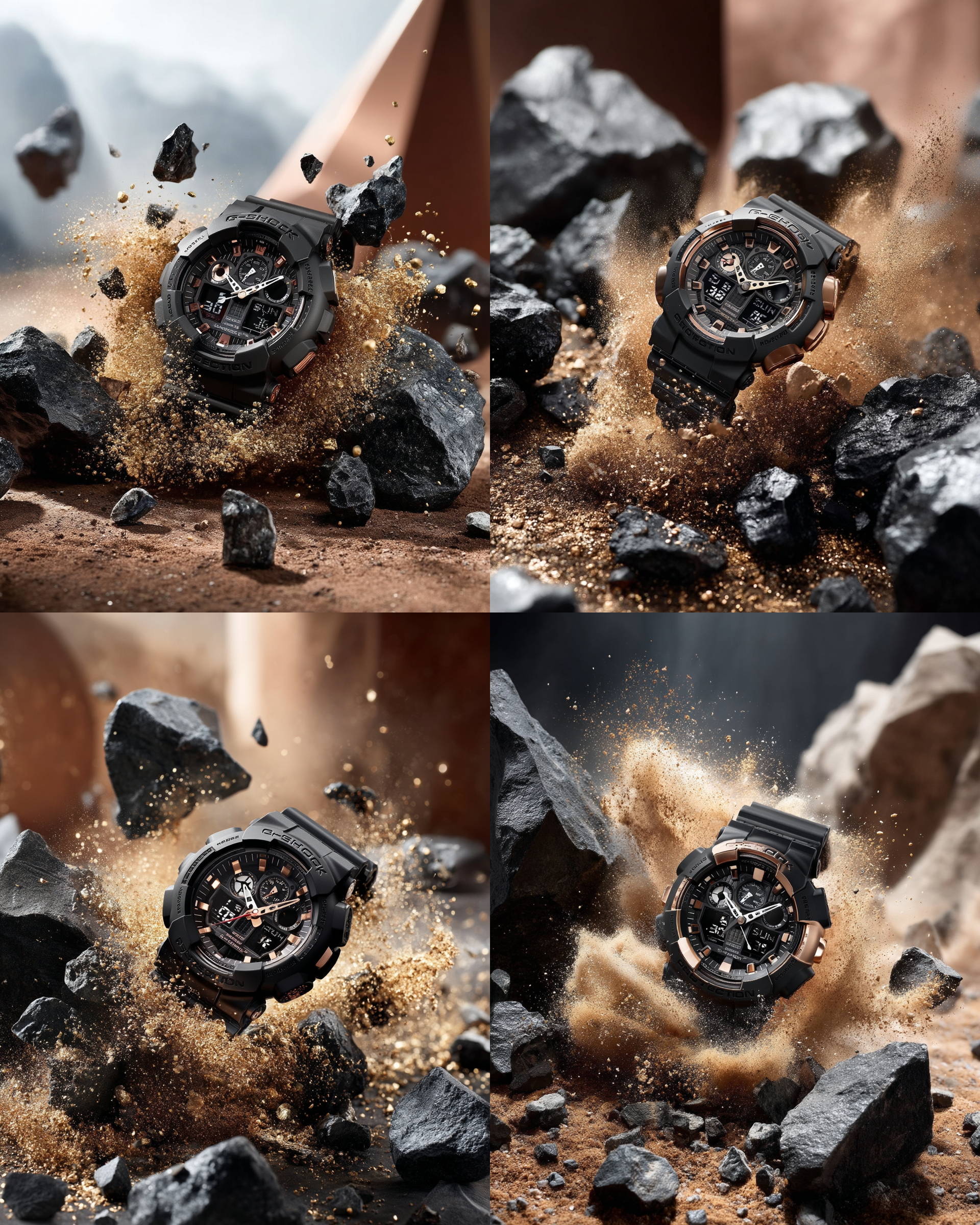 Casio G-SHOCK GA-100-1A1 watch in dramatic explosion of shattered black rocks