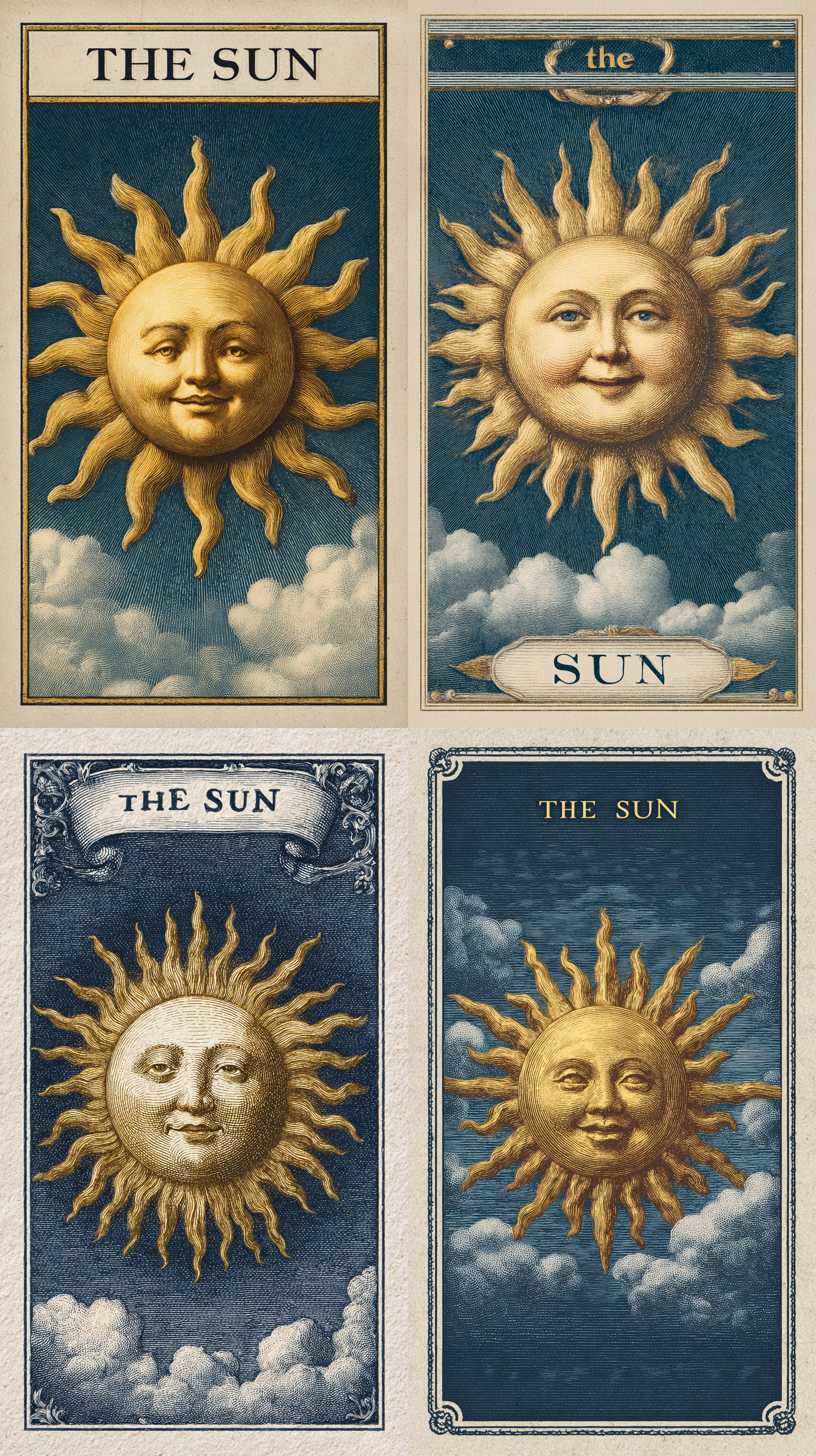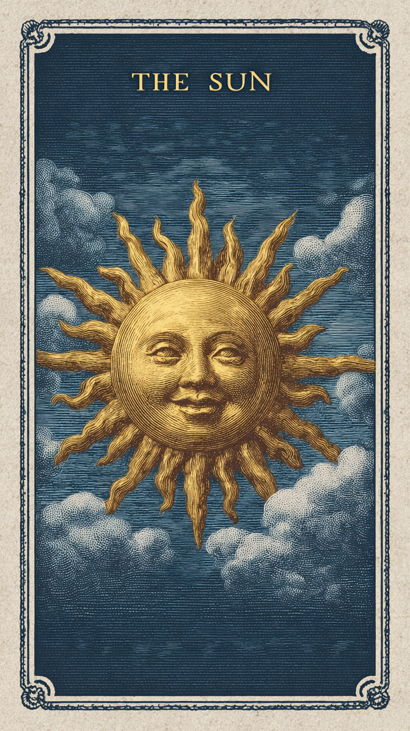 the sun with the face of an old woman smiling, in the style of gustave doré, tarot card style, "the sun" in large text at the top center of the frame, full-page design with a border and background, 3d render, oil painting, vintage illustration, golden age aesthetics, simple details, dark blue sky, white clouds, golden yellow sun rays, soft lighting, magical glow, dreamy atmosphere, surrealistic style, high resolution, hyper-realistic. --ar 9:16 --raw --profile oxtzgwe --v 7