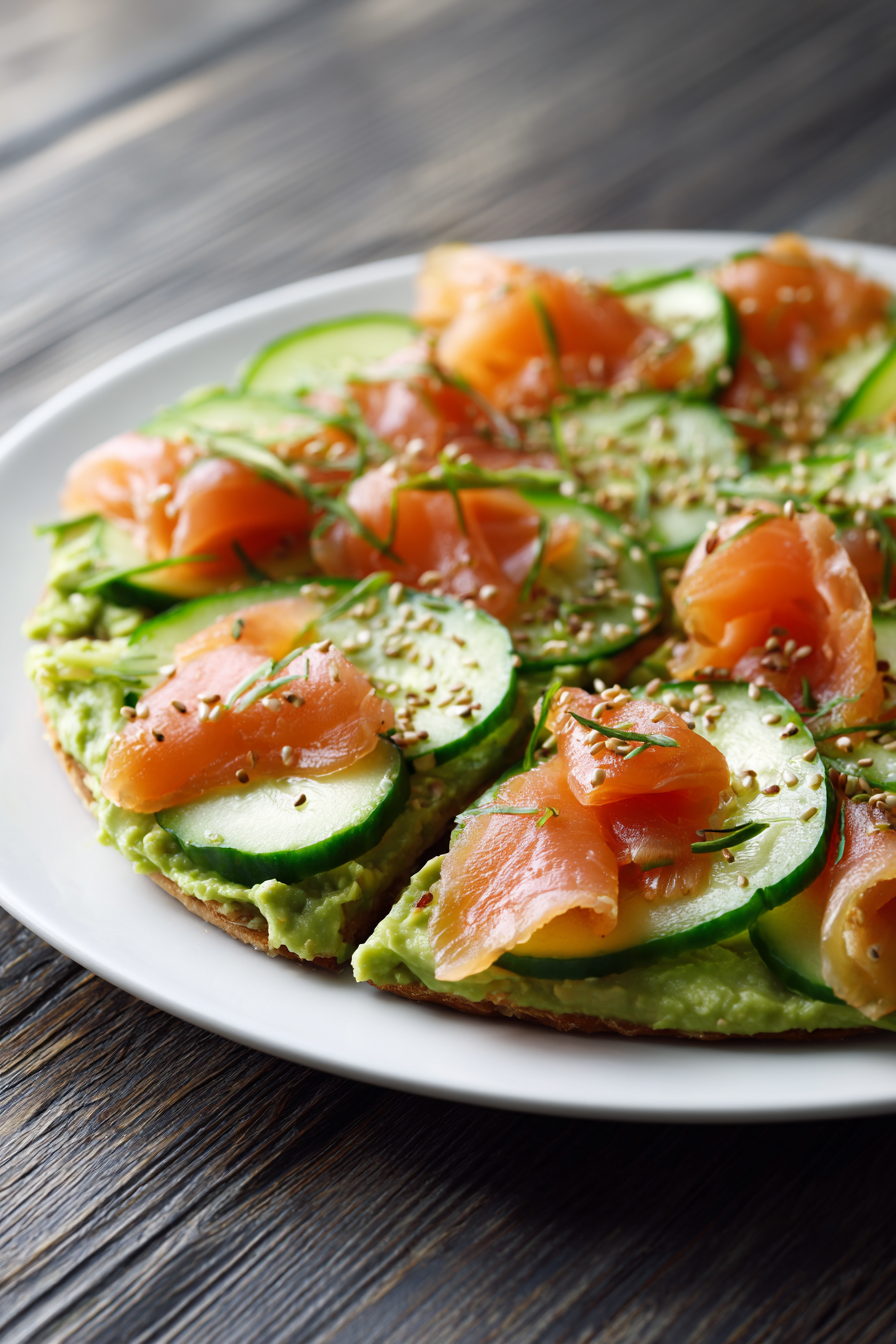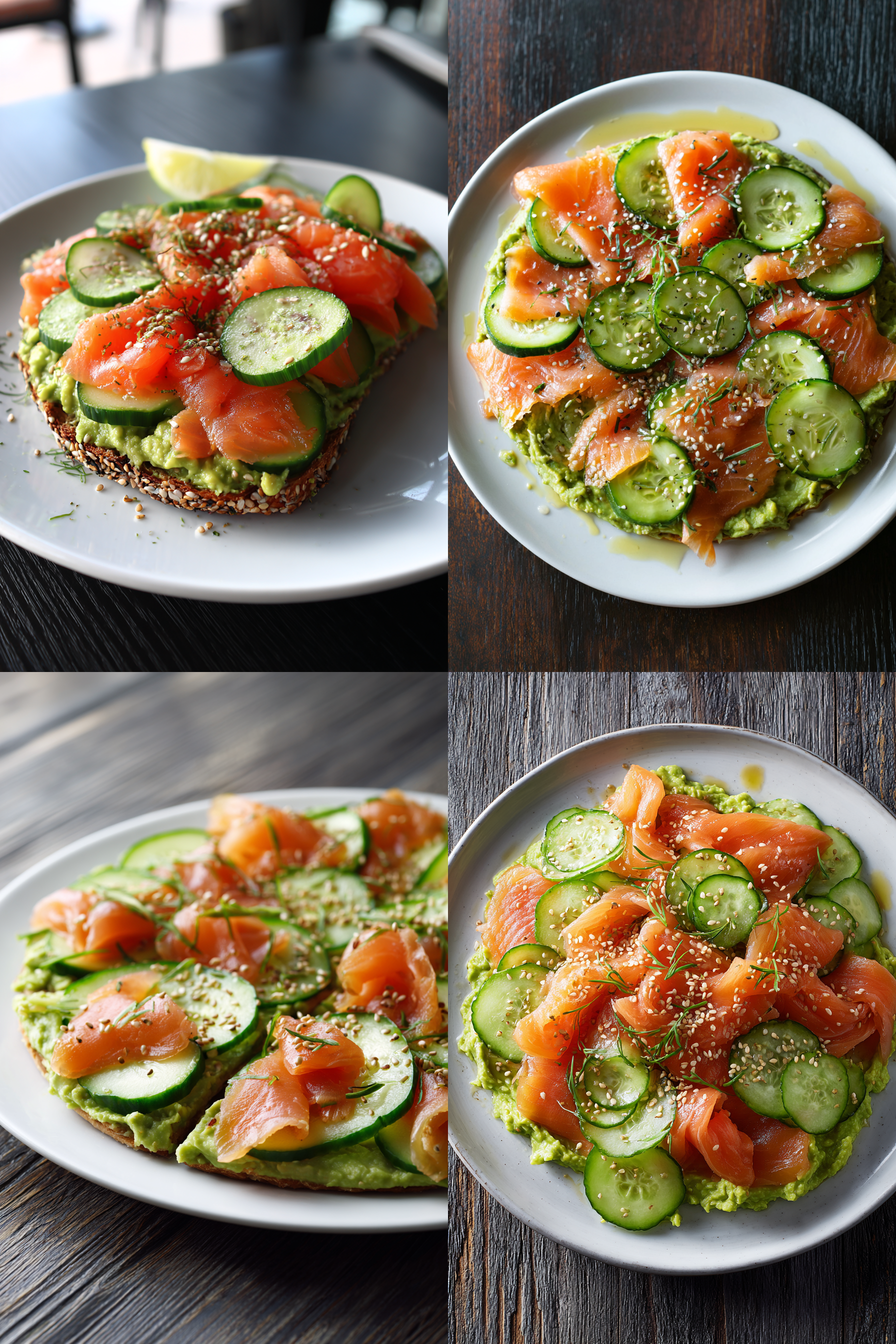 topped with abundant smoked salmon slices and plenty of fresh cucumber slices, all lightly drizzled with extra virgin olive oil for a glossy seasoned look, sprinkled with sesame seeds and finished with a touch of lime zest, arranged in a simple natural presentation that fills the entire white plate, served on a perfectly clean dark wooden table with nothing else on the surface, 45-degree angle shot, close-up food photography, shallow depth of field, food porn aesthetic, juicy glossy textures, hyper-appetizing details, natural soft side lighting, vibrant colors, crisp focus on front elements, ultra-realistic and mouthwatering look