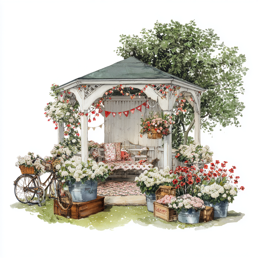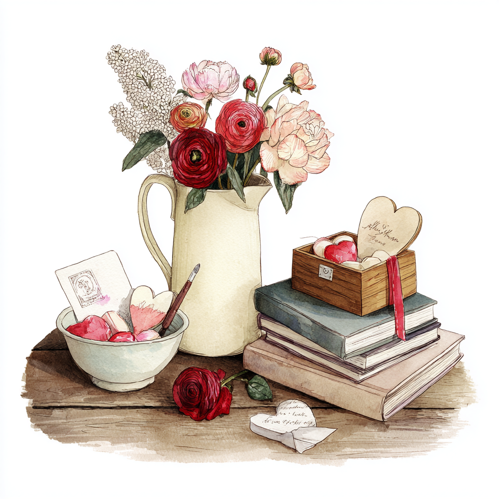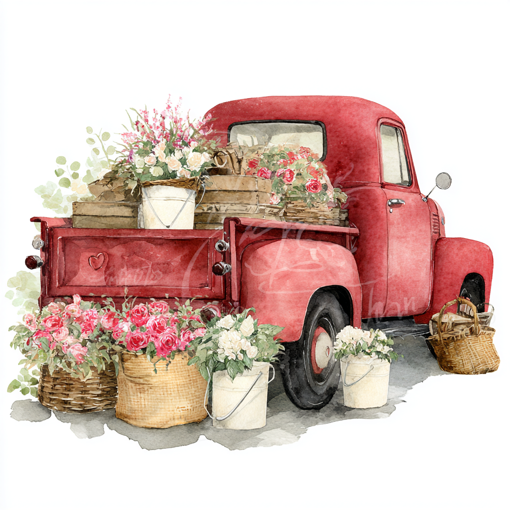 watercolor side rear view of vintage red truck, rustic heart on door, baskets and buckets of white, red and pink valentine flowers filling back of truck and around it, farmhouse valentine theme, png format, white background